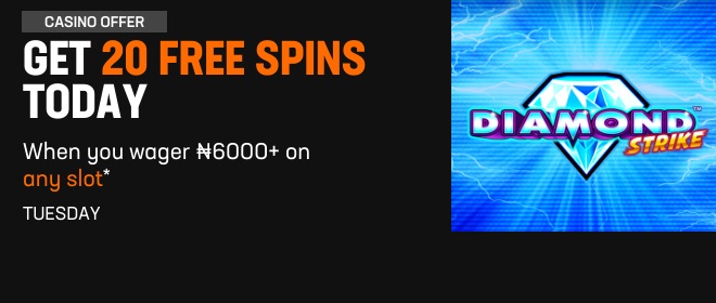 *Qualify once between 00:00 - 23:59 on Tuesday. Accept Free Spins the day you qualify and use on Diamond Strike (3-day expiry, ₦60 per spin). Terms and conditions apply.