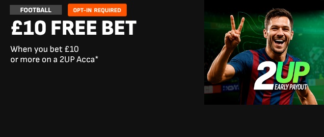 *Place a £10+ pre-match 5+ leg acca on 2UP offer eligible matches, 2/1 min odds. Free Bet: valid 7 days on Football markets. Stakes not returned. T&Cs apply.